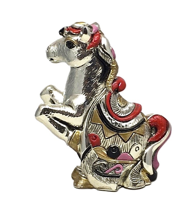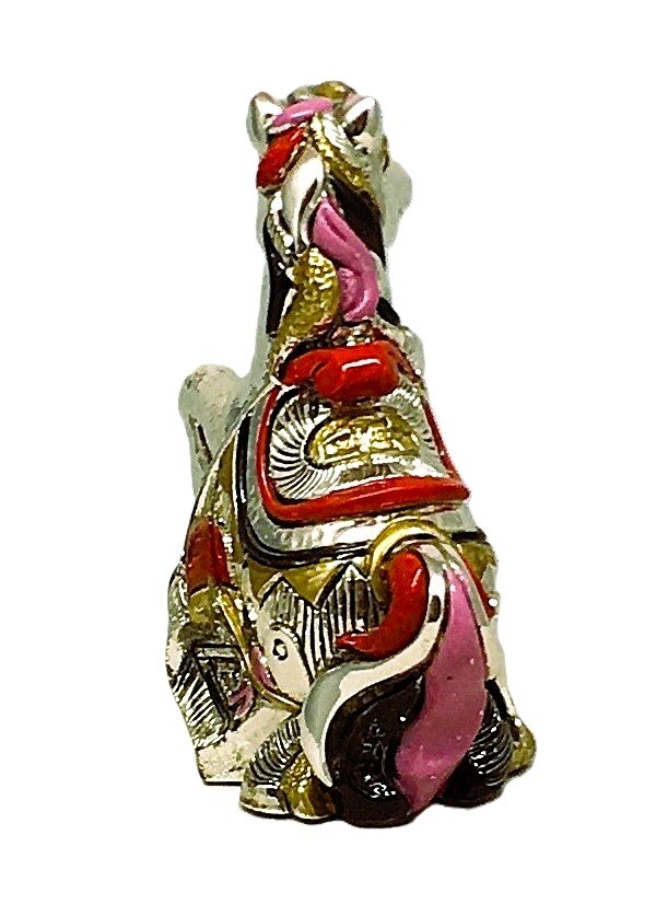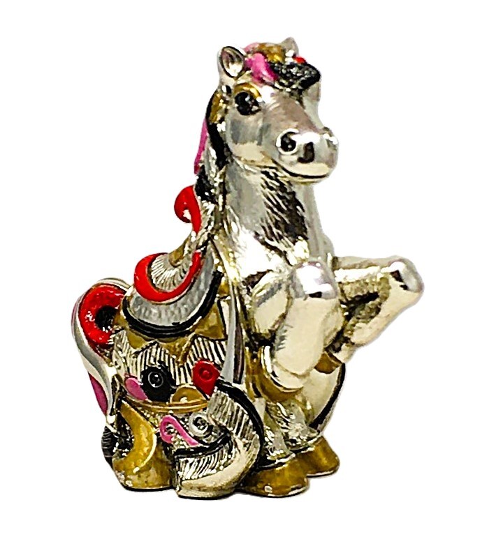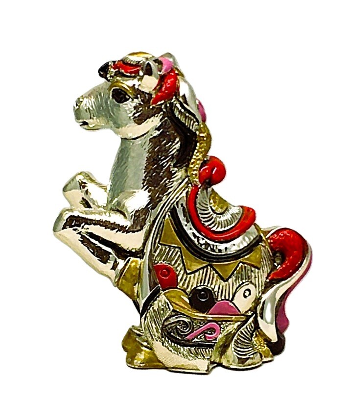 Статуэтка "Лошадь" произведена в Италии фабрикой Linea Argenti. Основа мраморная крошка и композитная смола, покрыто серебром 925 пробы методом гальванопластики, декорирована горячими эмалями и золотом 24к, фирменная упаковка, товар сертифицирован